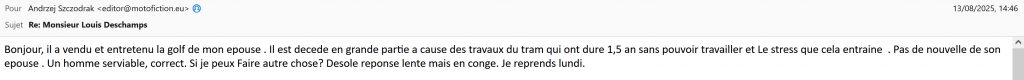 Ante learned that Mr. Deschamps could be about 19 or 20 at the time of the transport. It is not very hard to find some more information about the mechanic. Not only is he mentioned (with an address of his garage) by French and Belgian Simca enthusiasts in a thread of the Caradisiac forum (https://forum-auto.caradisiac.com/topic/372972-matra-bagheera/page/5/), but it is also his obituary that can be found on the Internet: https://www.enaos.net/P1220.aspx?IdPer=37701.