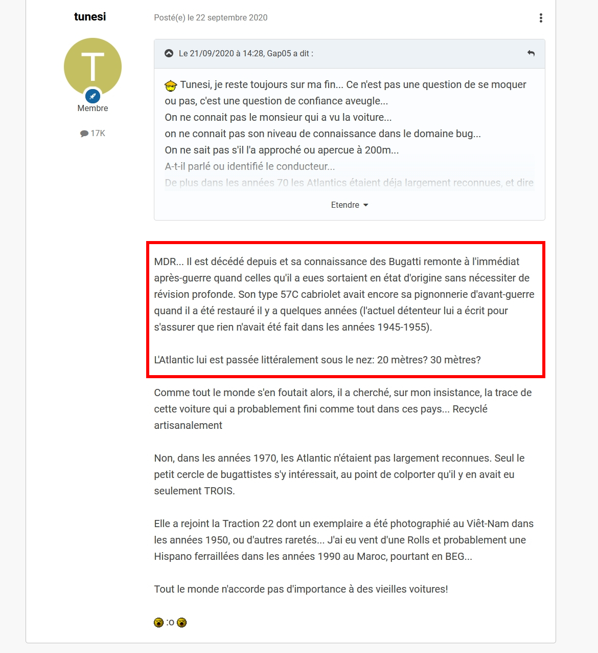 The second testimony is fully accessible to the public. It can be found on the French forum called Caradisiac. A gentleman who uses the nickname “Tunesi” writes that a friend of his father has seen a Bugatti Atlantic in Nigeria.